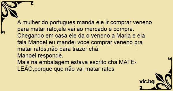 A mulher do portugues manda ele ir comprar veneno para matar rato,ele vai ao mercado e compra. Chegando em casa ele da o veneno a Maria e ela fala Manoel eu mandei voce comprar veneno pra matar ratos,não para trazer chà.