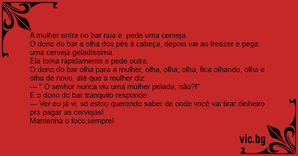 Uma mulher entra no bar nua, e o dono fica vendo todo se tremendo aí ela senta no balcão e pede uma cerveja, um bife e um refrigerante ai o cara faz rapidinho e fica olhando para ela se tremendo. A mulher pergunta: — Você nunca viu uma mulher pelada? E ele responde: — Mulher pelada eu já vi ,...