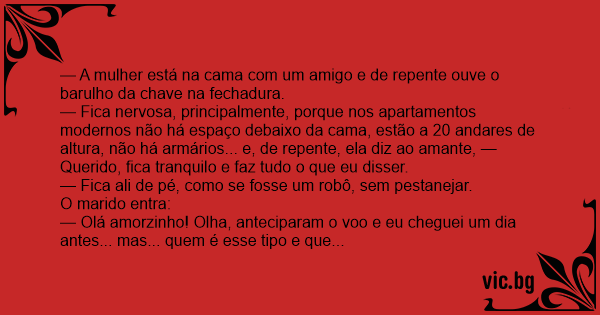 — A mulher está na cama com um amigo e de repente ouve o barulho da chave na fechadura.