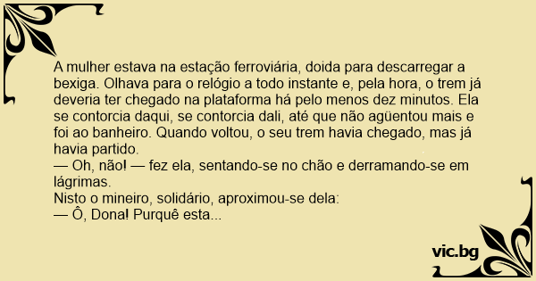 A mulher estava na estação ferroviária, doida para descarregar a bexiga. Olhava para o relógio a todo instante e, pela hоrа, o trem já deveria ter chegado na plataforma há pelo menos dez minutos. Ela se contorcia daqui, se contorcia dali, até que não agüentou mais e foi ao banheiro. Quando voltou, o seu trem havia chegado, mas já havia partido.