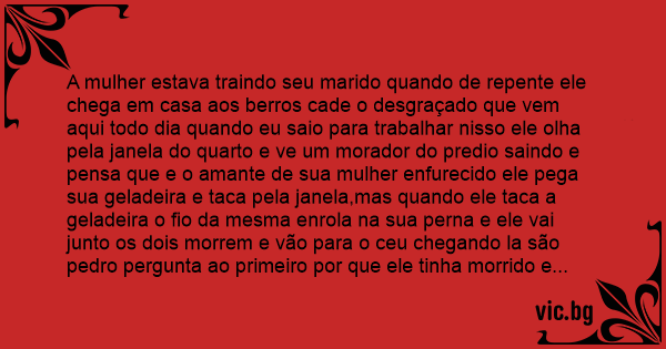 A mulher estava traindo seu marido quando de repente ele chega em casa aos berros cade o desgraçado que vem aqui todo dia quando eu saio para trabalhar nisso ele olha pela janela do quarto e ve um morador do predio saindo e pensa que e o amante de sua mulher enfurecido ele pega sua geladeira e taca pela janela,mas quando ele taca a geladeira o fio da mesma enrola na sua perna e ele vai junto os dois morrem e vão para o ceu chegando la são pedro pergunta ao primeiro por que ele tinha morrido e ele responde eu estava saindo da minha casa quando esse maluco jogou uma geladeira em cima da minha cabeça e voce perguntou são pedro eu quando eu joguei a geladeira o fio enroscou em minha perna e eu cai junto nisso vem chegando uma terceira pessoa e são pedro pergunta e vc por que morreu e o cara responde bem eu não sei direito eu estava com a minha amante na casa dela quando derepente o marido dela chegou e eu me escondi na geladeira