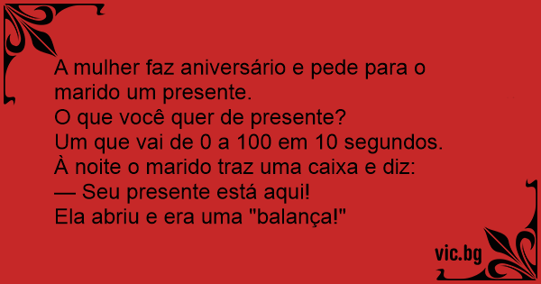 Megkérdeztem a nejemet mit szeretne a születésnapjára. Azt mondta, legyen piros és 3 mp alatt gyorsuljon 0-ról 100-ra. Vettem neki egy piros fürdőszobamérleget. Azóta nem áll velem szóba.