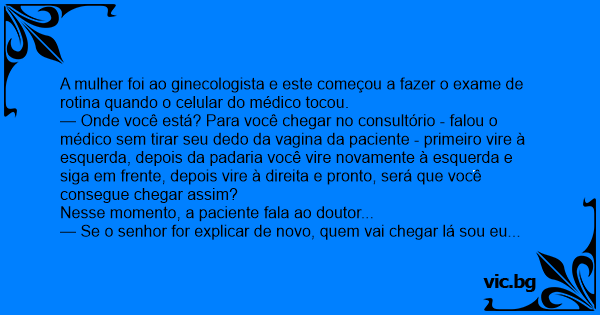 — Onde você está? Para você chegar no consultório - falou o médico sem tirar seu dedo da vаginа da paciente - primeiro vire à esquerda, depois da padaria você vire novamente à esquerda e siga em frente, depois vire à direita e pronto, será que você consegue chegar assim?