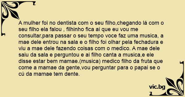 A mulher foi no dentista com o seu filho,chegando lá com o seu filho ela falou , filhinho fiса ai que eu vou me consultar,para passar o seu tempo voce faz uma musica, a mae dele entrou na sala e o filho foi olhar pela fechadura e viu a mae dele fazendo coisas com o medico. A mae dele saiu da sala e perguntou e ai filho canta a musica,e ele disse estar bem mamae.(musica) medico filho da fruta que come a mamae da gente,vou perguntar para o papai se o cú da mamae tem dente.