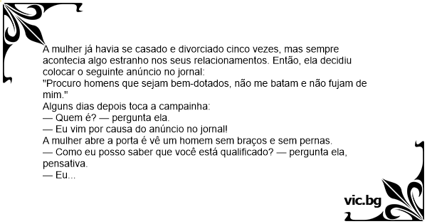 Uma viúva rica e solitária decidiu que precisava de um outro homem em sua vida, então colocou um anuncio no qual podia-se ler: "Viúva rica procura por homem para compartilhar vida e fortuna....