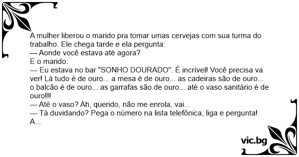 — Eu estava no bar "SONHO DOURADO". É incrível! Você precisa va ver! Lá tudo é de ouro... a mesa é de ouro... as cadeiras são de ouro... o balcão é de ouro... as garrafas são de ouro... até o vaso sanitário é de ouro!!!