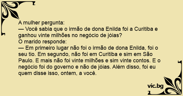 — Você sabia que o irmão de dona Enilda foi a Curitiba e ganhou vinte milhões no negócio de jóias?