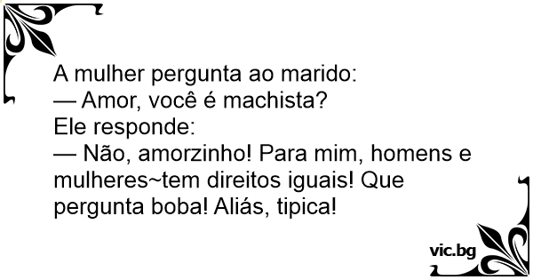 — Não, amorzinho! Para mim, homens e mulheres~tem direitos iguais! Que pergunta boba! Aliás, tipica!