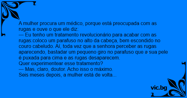 — Eu tenho um tratamento revolucionário para acabar com as rugas:coloco um parafuso no alto da cabeça, bem escondido no couro cabeludo. Aí, toda vez que a senhora perceber as rugas aparecendo, bastadar um pequeno giro no parafuso que a sua pele é puxada para cima e as rugas desaparecem.