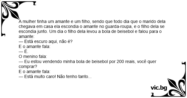 A mulher tinha um amante e um filho, sendo que todo dia que o marido dela chegava em casa ela escondia o amante no guarda-roupa, e o filho dela se escondia junto. Um dia o filho dela levou a bola de beisebol e falou para o amante: