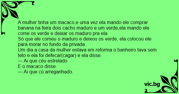 A mulher tinha um macaco,e uma vez ela mando ele comprar banana na feira dois cacho maduro e um verde,ela mando ele come os verde e deixar os maduro pra ela.