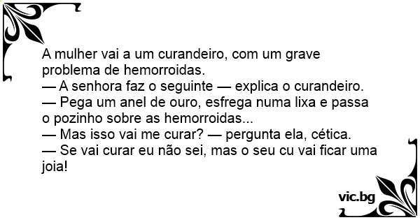 — A senhora faz o seguinte — explica o curandeiro. — Pega um anel de ouro, esfrega numa lixa e passa o pozinho sobre as hemorroidas...