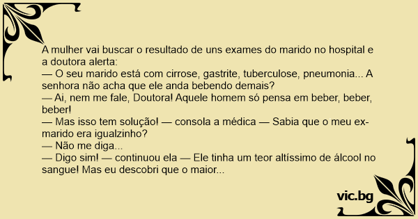 — O seu marido está com cirrose, gastrite, tuberculose, pneumonia... A senhora não acha que ele anda bebendo demais?