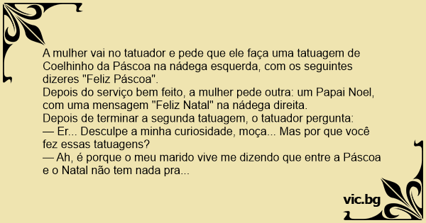 A mulher vai no tatuador e pede que ele faça uma tatuagem de Coelhinho da Páscoa na nádega esquerda, com os seguintes dizeres "Feliz Páscoa".