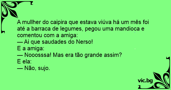 A mullher do caipira que estava viúva há um mês foi até a barraca de legumes, pegou uma mandioca e comentou com a amiga: