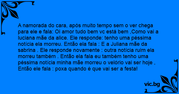 A namorada do cara, após muito tempo sem o ver chega para ele e fala: Oi amor tudo bem vc está bem ,Como vai a luciana mãe da alice. Ele responde: tenho uma péssima notícia ela morreu. Então ela fala : E a Juliana mãe da sabrina . Ele responde novamente : outra notícia ruim ela morreu também . Então ela fala eu também tenho uma péssima notícia minha mãe morreu o velório vai ser hoje , Então ele fala : poxa quando é que vai ser a festa!