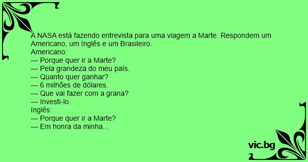 A NASA está fazendo entrevista para uma viagem a Marte. Respondem um Americano, um Inglês e um Brasileiro.