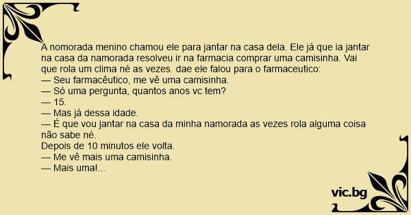 A nomorada menino chamou ele para jantar na casa dela. Ele já que ia jantar na casa da namorada resolveu ir na farmacia comprar uma camisinha. Vai que rola um clima né as vezes. dae ele falou para o farmaceutico: