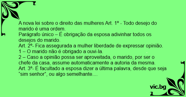 A nova lei sobre o direito das mulheres Art. 1º - Todo desejo do marido é uma ordem.