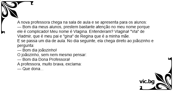 — Bom dia meus alunos, prestem bastante atenção no meu nome porque ele é complicado! Meu nome é Vlagina. Entenderam? Vlagina! "Vla" de Vladmir, que é meu pai e "gina" de Rеginа que é a minha mãe.