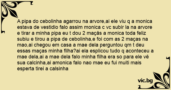 A рiра do cebolinha agarrou na arvore,ai ele viu q a monica estava de vestidio falo assim monica c vc subir la na arvore e tirar a minha рiра eu t dou 2 maçâs a monica toda feliz subiu e tirou a рiра de cebolinha,e foi com as 2 maças na mao,ai chegou em casa a mae dela perguntou qm t deu essas maças minha filha?ai ela esplicou tudo q aconteceu a mae dela,ai a mae dela falo minha filha era so para ele vê sua calcinha,ai amonica falo nao mae eu fui muiti mais esperta tirei a calsinha