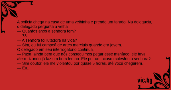 A polícia chega na casa de uma velhinha e prende um таrаdо. Na delegacia, o delegado pergunta a velha: