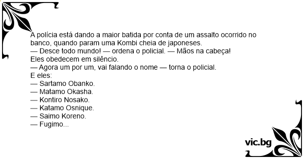 A polícia está dando a maior batida por conta de um assalto ocorrido no banco, quando param uma Kombi cheia de japoneses.