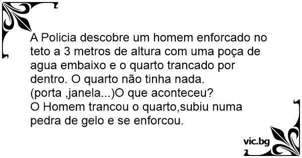 A Policia descobre um homem enforcado no teto a 3 metros de altura com uma poça de agua embaixo e o quarto trancado por dentro. O quarto não tinha nada.(porta ,janela...)O que aconteceu?