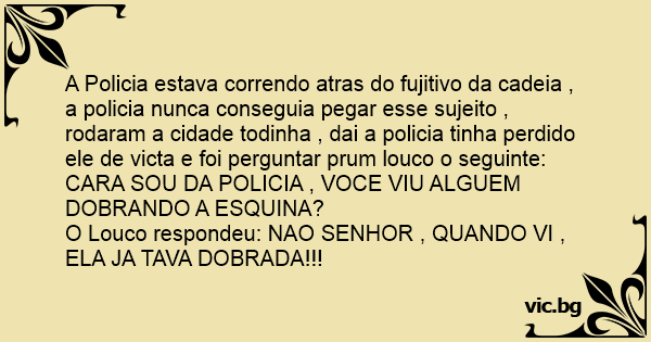 A Policia estava correndo atras do fujitivo da cadeia , a policia nunca conseguia pegar esse sujeito , rodaram a cidade todinha , dai a policia tinha perdido ele de victa e foi perguntar prum louco o seguinte: CARA SOU DA POLICIA , VOCE VIU ALGUEM DOBRANDO A ESQUINA?