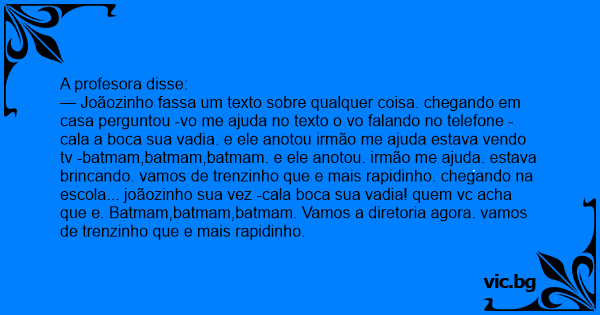 — Joãozinho fassa um texto sobre qualquer coisa. chegando em casa perguntou -vo me ajuda no texto o vo falando no telefone -cala a boca sua vadia. e ele anotou irmão me ajuda estava vendo tv -batmam,batmam,batmam. e ele anotou. irmão me ajuda. estava brincando. vamos de trenzinho que e mais rapidinho. chegando na escola... joãozinho sua vez -cala boca sua vadia! quem vc acha que e. Batmam,batmam,batmam. Vamos a diretoria agora. vamos de trenzinho que e mais rapidinho.