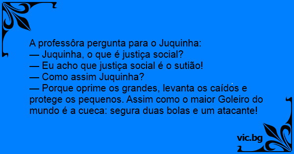 — Porque oprime os grandes, levanta os caídos e protege os pequenos. Assim como o maior Goleiro do mundo é a cueca: segura duas bolas e um atacante!