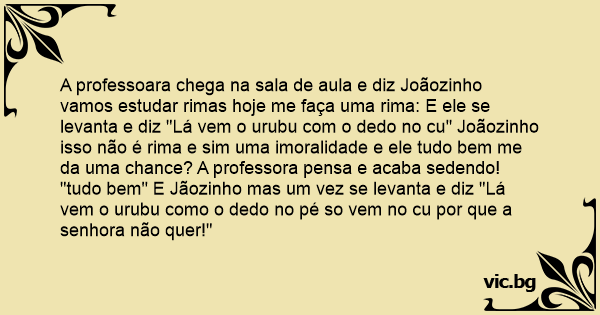 A professoara chega na sala de aula e diz Joãozinho vamos estudar rimas hoje me faça uma rima: E ele se levanta e diz "Lá vem o urubu com o dedo no cu" Joãozinho isso não é rima e sim uma imoralidade e ele tudo bem me da uma chance? A professora pensa e acaba sedendo! "tudo bem" E Jãozinho mas um vez se levanta e diz "Lá vem o urubu como o dedo no pé so vem no cu por que a senhora não quer!"