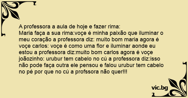 Maria faça a sua rima:voçe é minha paixão que iluminar o meu coração a professora diz: muito bom maria agora é voçe carlos: voçe é como uma flor e iluminar aonde eu estou a professora diz:muito bom carlos agora é voçe joãozinho: urubur tem cabelo no cú a professora diz:isso não pode faça outra ele pensou e falou urubur tem cabelo no pé por que no cú a profssora não quer!!!