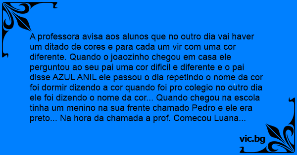 A professora avisa aos alunos que no outro dia vai haver um ditado de cores e para cada um vir com uma cor diferente. Quando o joaozinho chegou em casa ele perguntou ao seu pai uma cor dificil e diferente e o pai disse AZUL ANIL ele passou o dia repetindo o nome da cor foi dormir dizendo a cor quando foi pro colegio no outro dia ele foi dizendo o nome da cor... Quando chegou na escola tinha um menino na sua frente chamado Pedro e ele era preto... Na hоrа da chamada a prof. Comecou Luana Amarelo,Marcio Azul,Pedrinho Azul anil Joaozinho PRETO FILHO DA РUТА.
