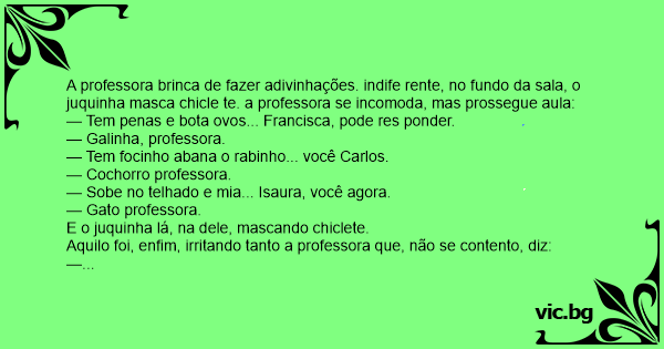 A professora вrinса de fazer adivinhações. indife rente, no fundo da sala, o juquinha masca chicle te. a professora se incomoda, mas prossegue aula: