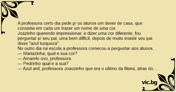A professora certo dia pede p/ os alunos um dever de casa, que consistia em cada um trazer um nome de uma cor.