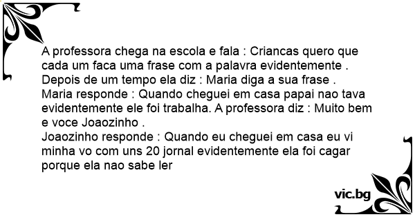 A professora chega na escola e fala : Criancas quero que cada um faca uma frase com a palavra evidentemente . Depois de um tempo ela diz : Maria diga a sua frase .