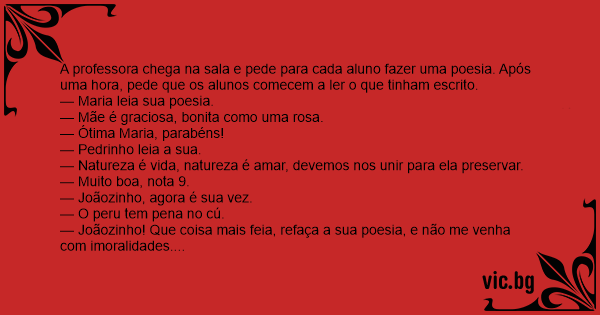 Depois de 10 minutos a professora pede que ele releia a nova poesia. Então Joãozinho pega o papel e lê: