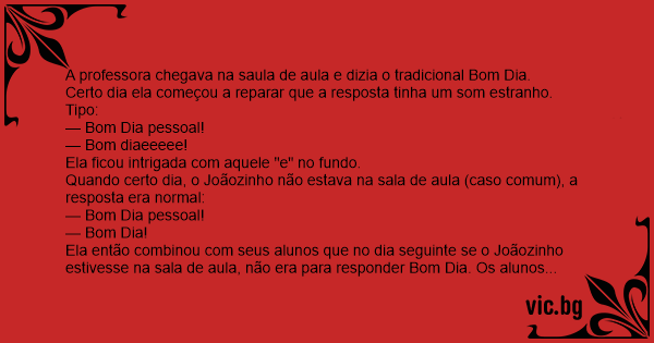Ela então combinou com seus alunos que no dia seguinte se o Joãozinho estivesse na sala de aula, não era para responder Bom Dia. Os alunos concordaram e dito e feito: