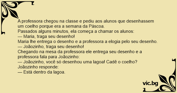 A professora chegou na classe e pediu aos alunos que desenhassem um coelho porque era a semana da Páscoa.