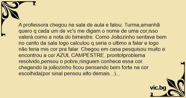 A professora chegou na sala de aula e falou: Turma,amanhã quero q cada um de vc's me digam o nome de uma cor,isso valerá como a nota do bimestre. Como Joãozinho sentava bem no canto da sala logo calculou q seria o ultimo a falar e logo não teria mis cor pra falar. Chegou em casa pesquisou muito e encontrou a cor AZUL CAMPESTRE. pronto!problema resolvido,pensou o pobre,ninguem conhece essa cor. chegando la joãozinho ficou pensando bem forte na cor escolhida(por sinal pensou alto demais...) professora chegou e perguntou: