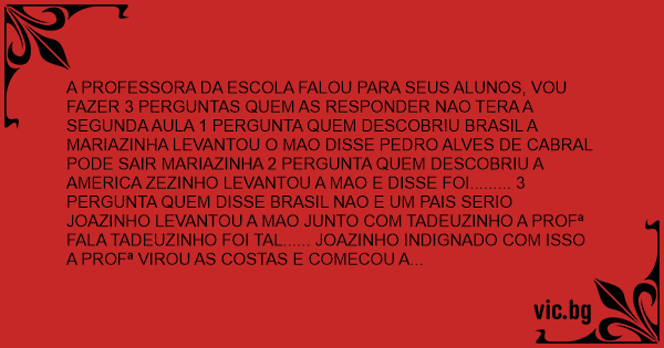 A PROFESSORA DA ESCOLA FALOU PARA SEUS ALUNOS, VOU FAZER 3 PERGUNTAS QUEM AS RESPONDER NAO TERA A SEGUNDA AULA 1 PERGUNTA QUEM DESCOBRIU BRASIL A MARIAZINHA LEVANTOU O MAO DISSE PEDRO ALVES DE CABRAL PODE SAIR MARIAZINHA 2 PERGUNTA QUEM DESCOBRIU A AMERICA ZEZINHO LEVANTOU A MAO E DISSE FOI......... 3 PERGUNTA QUEM DISSE BRASIL NAO E UM PAIS SERIO JOAZINHO LEVANTOU A MAO JUNTO COM TADEUZINHO A PROFª FALA TADEUZINHO FOI TAL...... JOAZINHO INDIGNADO COM ISSO A PROFª VIROU AS COSTAS E COMECOU A ESCREVER A LOUSA NISSO JOAZINHO GRITOU BEM ALTO CHUPA MEU РАU SUA VAGABUNDA A PROFª VIROU E DISSE QUEM FALOU ISSO JOAZINHO RESPONDEU FOI...... BILL CLINTON