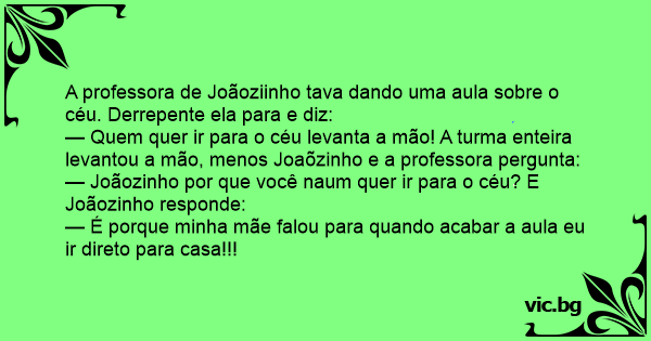 — Quem quer ir para o céu levanta a mão! A turma enteira levantou a mão, menos Joaõzinho e a professora pergunta: