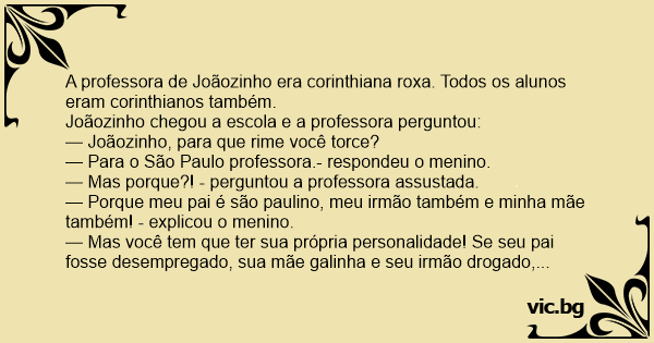 A professora de Joãozinho era corinthiana roxa. Todos os alunos eram corinthianos também.