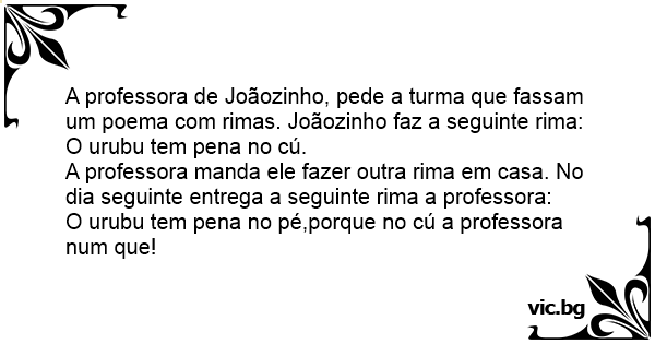 A professora de Joãozinho, pede a turma que fassam um poema com rimas. Joãozinho faz a seguinte rima: