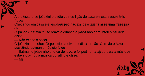 — Batman o joãozinho anotou denovo, e foi pedir uma ajuda para a mãe que estava ouvindo a musica do latino e disse: