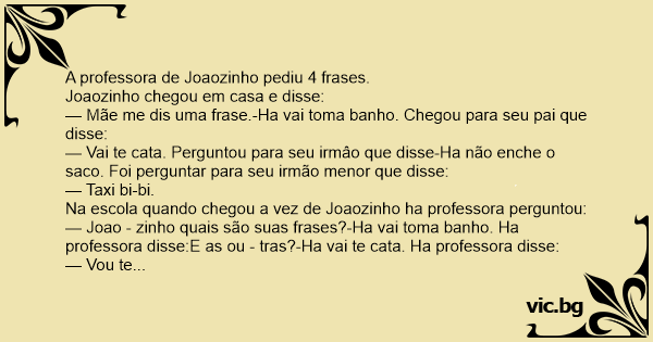— Joao - zinho quais são suas frases?-Ha vai toma banho. Ha professora disse:E as ou - tras?-Ha vai te cata. Ha professora disse: