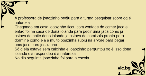 Só q ela estava sem calcinha e joaozinho perguntou oq é isso dona iolanda ela respondeu é a natureza.