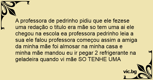 A professora de pedrinho pidiu que ele fezese uma redação o titulo era mãe so tem uma ai ele chegou na escola ea professora pedrinho leia a sua ele falou professora começou assim a amiga da minha mãe foi almosar na minha casa e minha mãe mandou eu ir pegar 2 refrigerante na geladeira quando vi mãe SO TENHE UMA