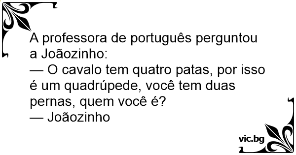 — O cavalo tem quatro patas, por isso é um quadrúpede, você tem duas pernas, quem você é?